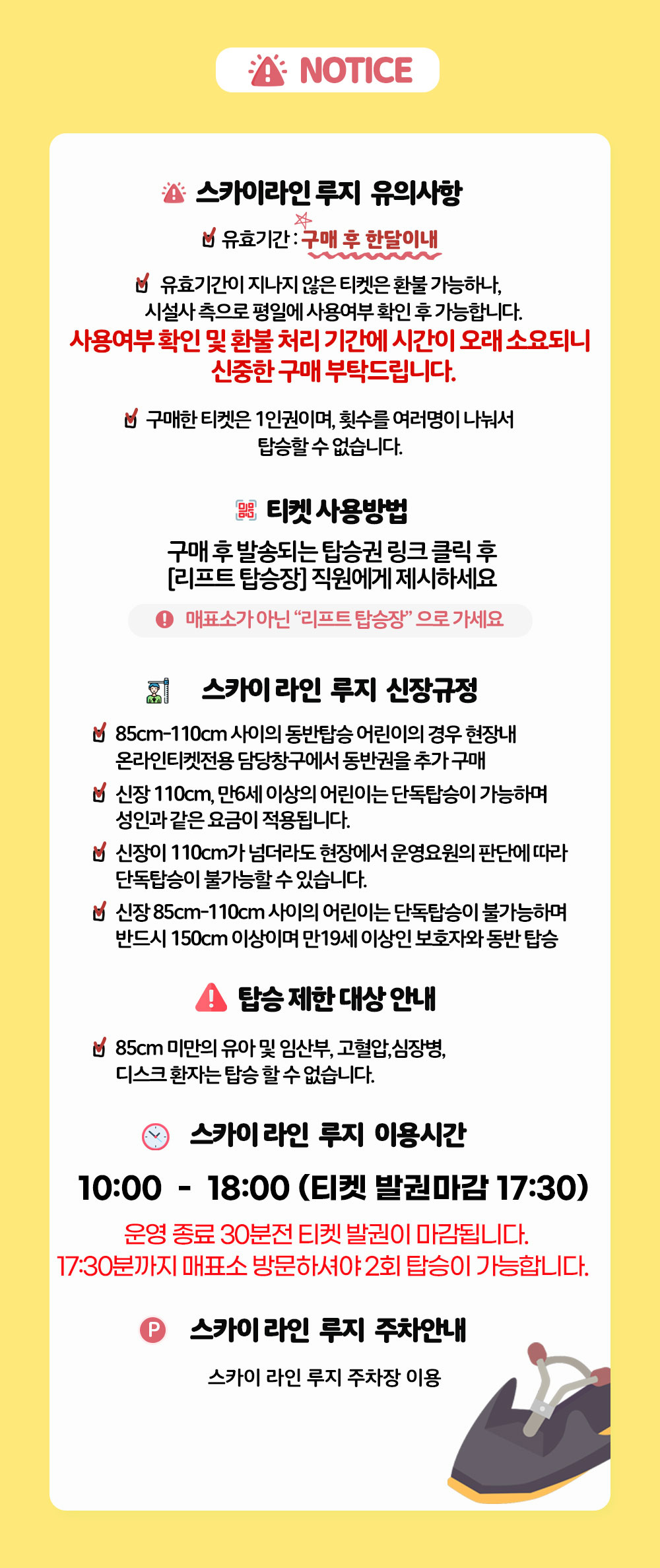 (아쉽지만 85cm 이하의 어린이들은 스카이라이드나 루지에 탑승할 수 없습니다).