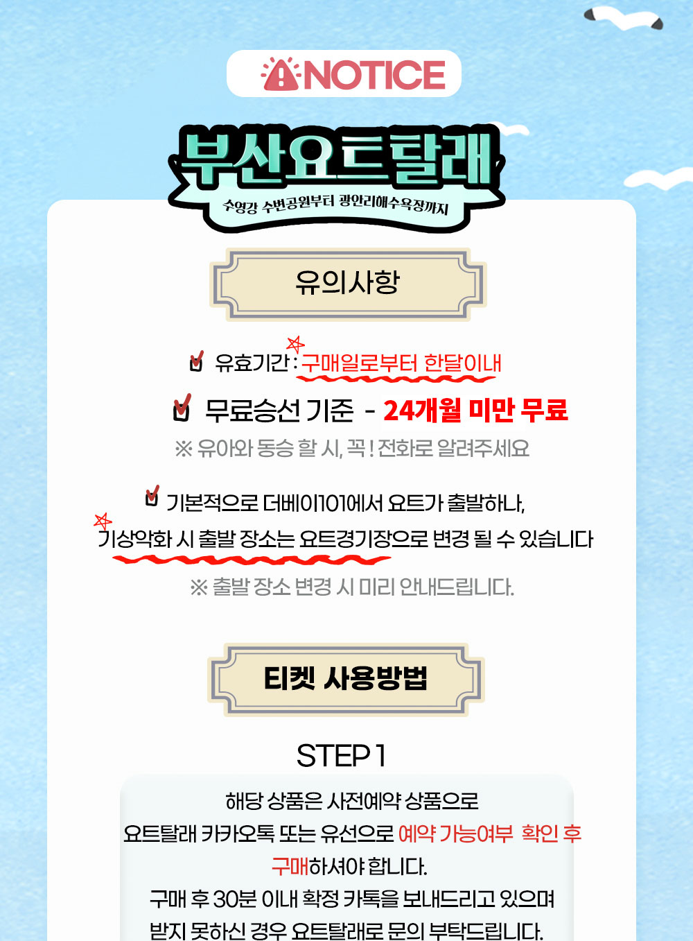 ※ 기상청 발표 기상악화(풍랑 주의보 / 태풍 주의보 호우 주의보 등)로 인한 취소시에는 무료 일정 변경 해드립니다.